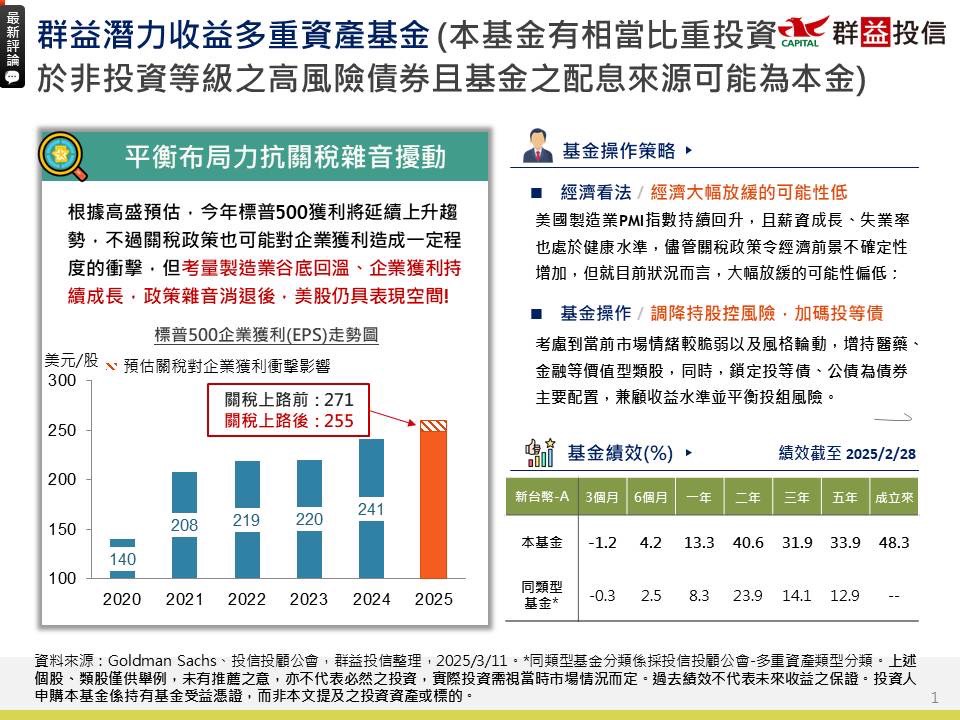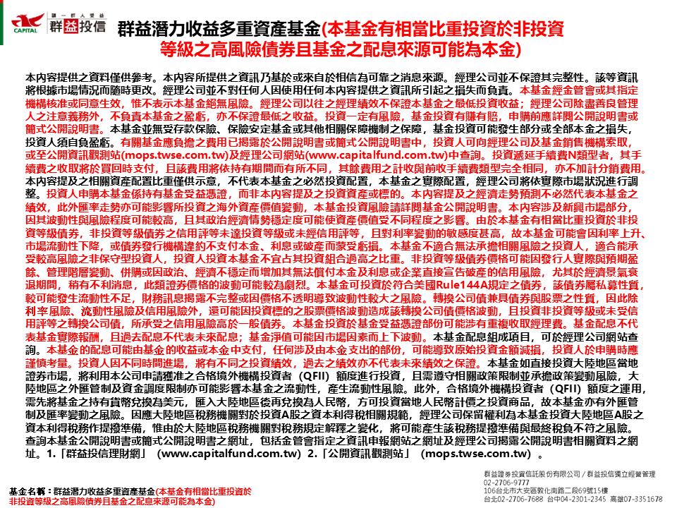 【經理人評論】「群益潛力收益多重資產基金」(本基金有相當比重投資於非投資等級之高風險債券且基金之配息來源可能為本金) 3月份經理人評論
