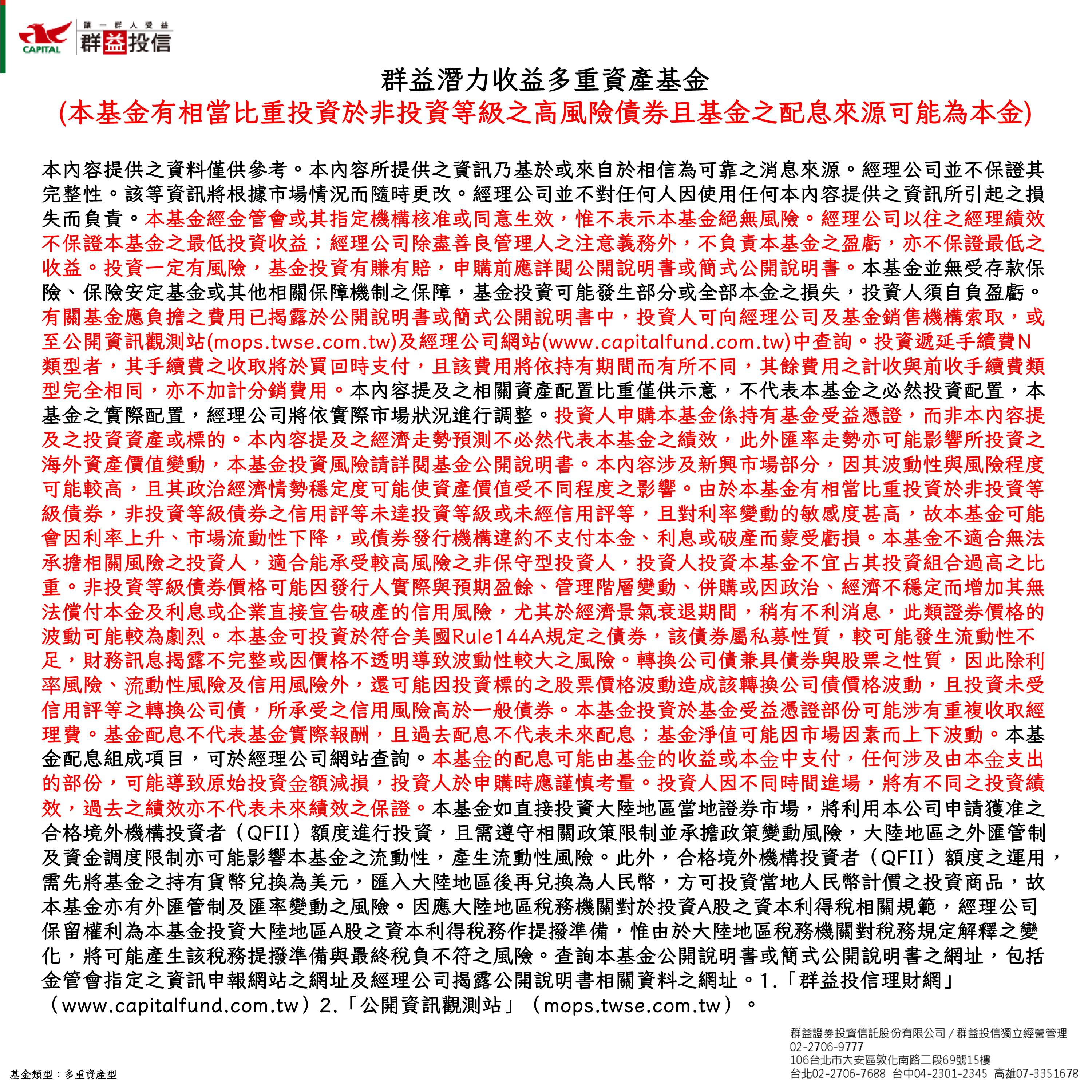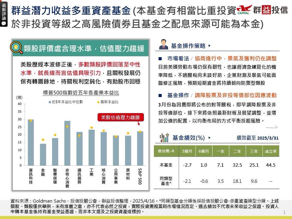 【經理人評論】「群益潛力收益多重資產基金」(本基金有相當比重投資於非投資等級之高風險債券且基金之配息來源可能為本金) 4月份經理人評論