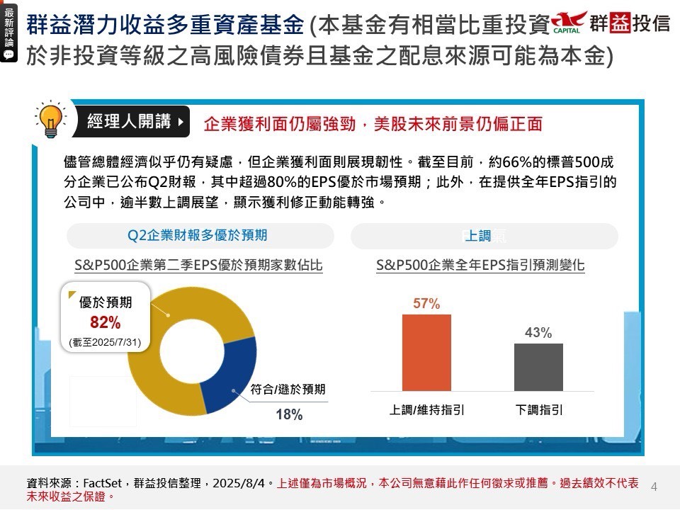 截至目前,逾六成標普500企業已公布Q2財報,其中逾八成EPS優於預期,半數以上企業上調全年展望,顯示獲利修正動能增強。