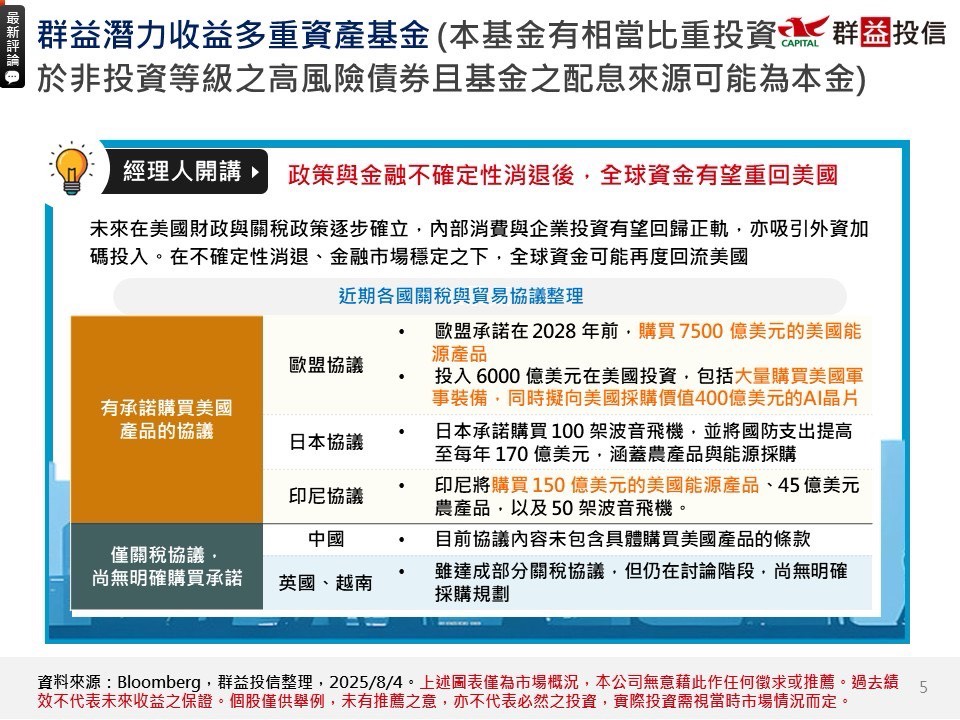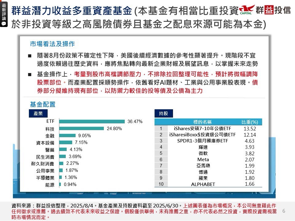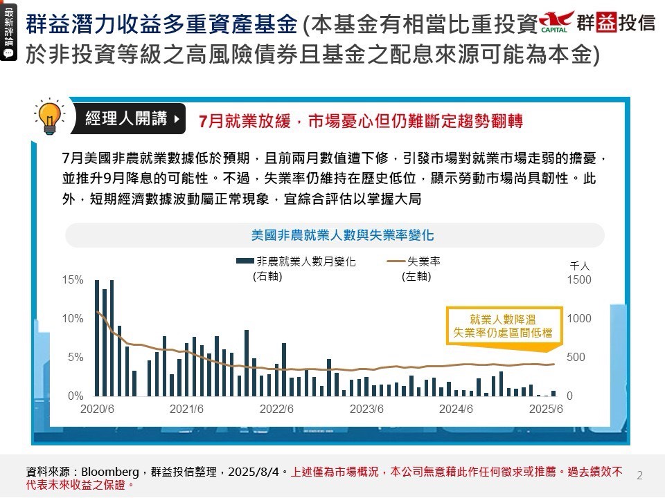 【經理人評論】「群益潛力收益多重資產基金」(本基金有相當比重投資於非投資等級之高風險債券且基金之配息來源可能為本金) 8月份經理人評論