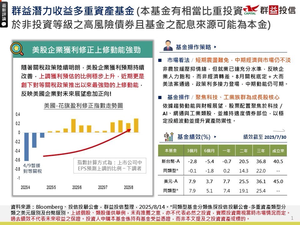 【經理人評論】「群益潛力收益多重資產基金」(本基金有相當比重投資於非投資等級之高風險債券且基金之配息來源可能為本金) 8月份經理人評論