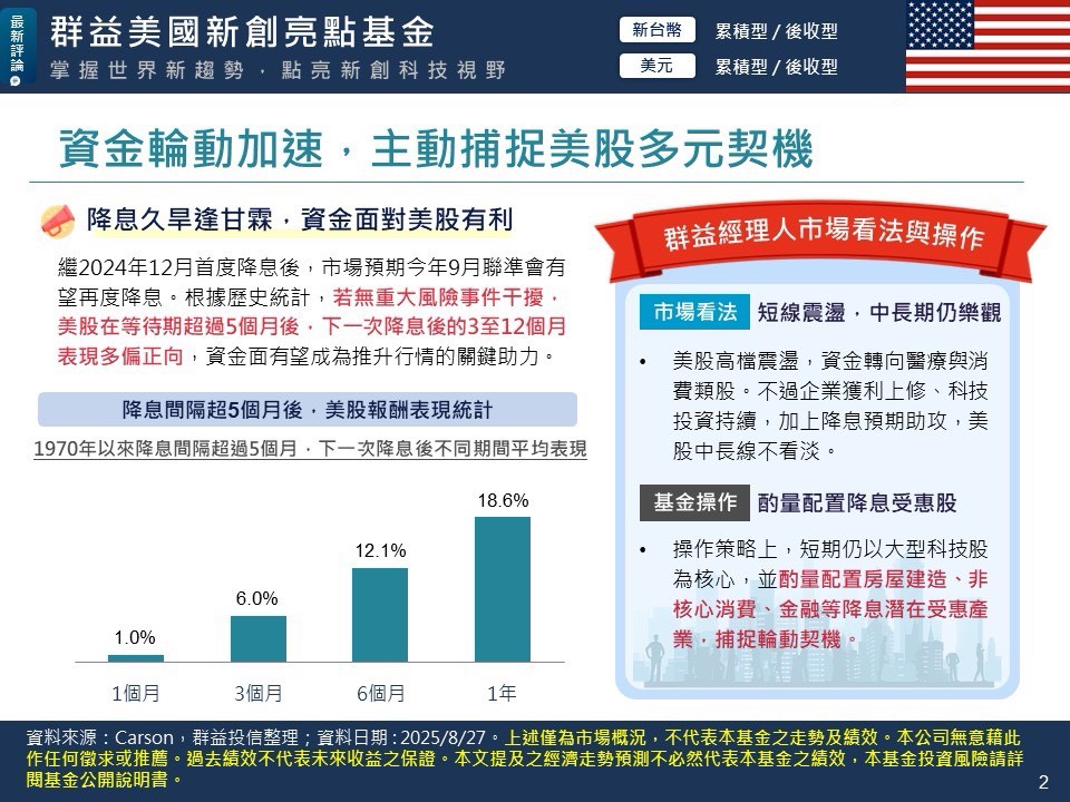 繼2024年12月首度降息後,市場預期今年9月聯準會有望再度降息。根據歷史統計,若無重大風險事件干擾,美股在等待期超過5個月後,下一次降息後的3至12個月表現多偏正向,資金面有望成為推升行情的關鍵助力。