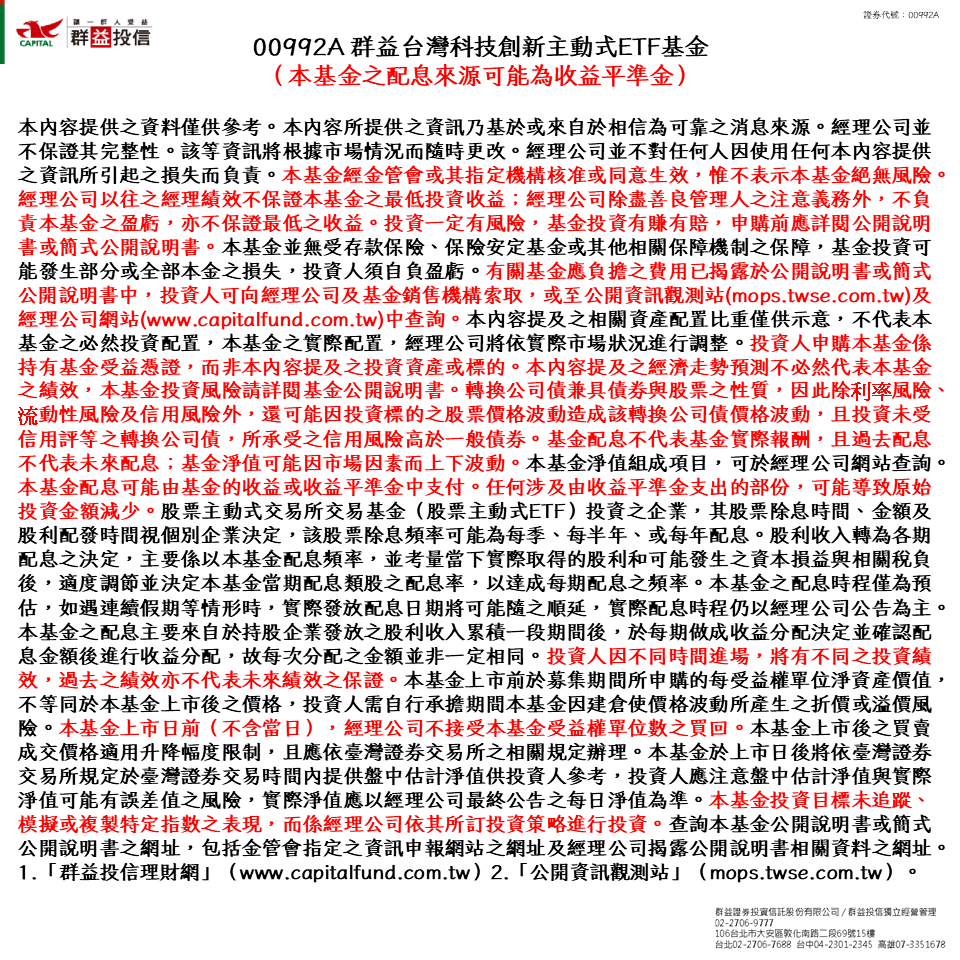 延伸閱讀:00992A 群益台灣科技創新主動式ETF基金 (本基金之配息來源可能為收益平準金)