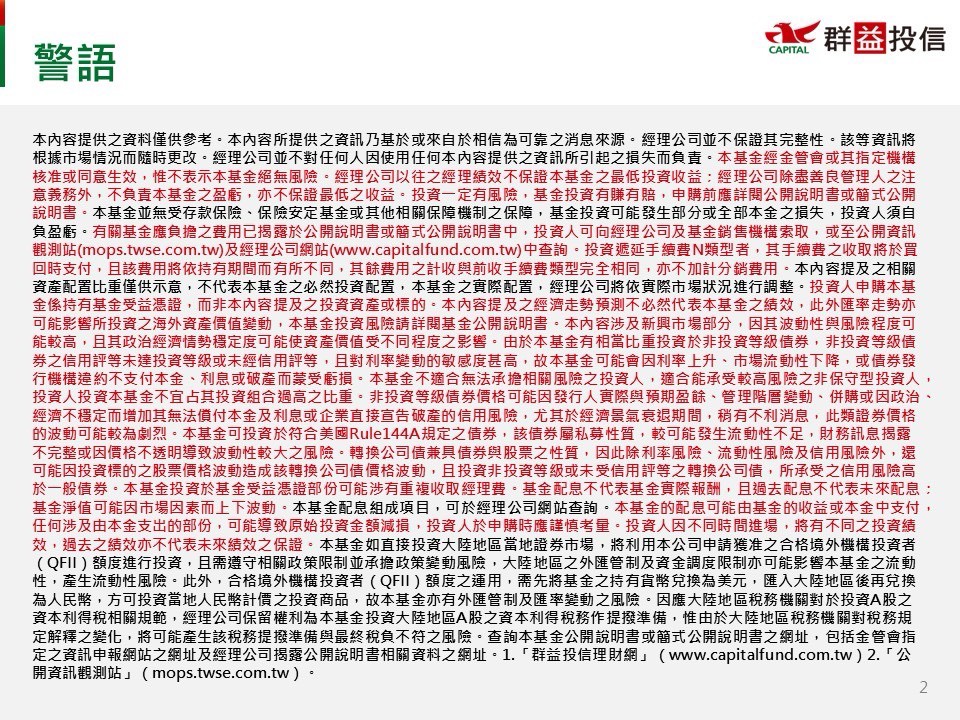 【經理人評論】「群益潛力收益多重資產基金」(本基金有相當比重投資於非投資等級之高風險債券且基金之配息來源可能為本金) 最新市場評論