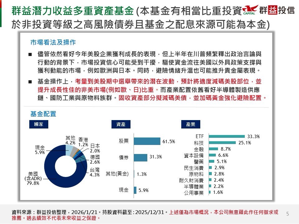 - 延伸閱讀:群益潛力收益多重資產基金(本子基金有相當比重投資於非投資等級之高風險債券且基金之配息來源可能為本金)|