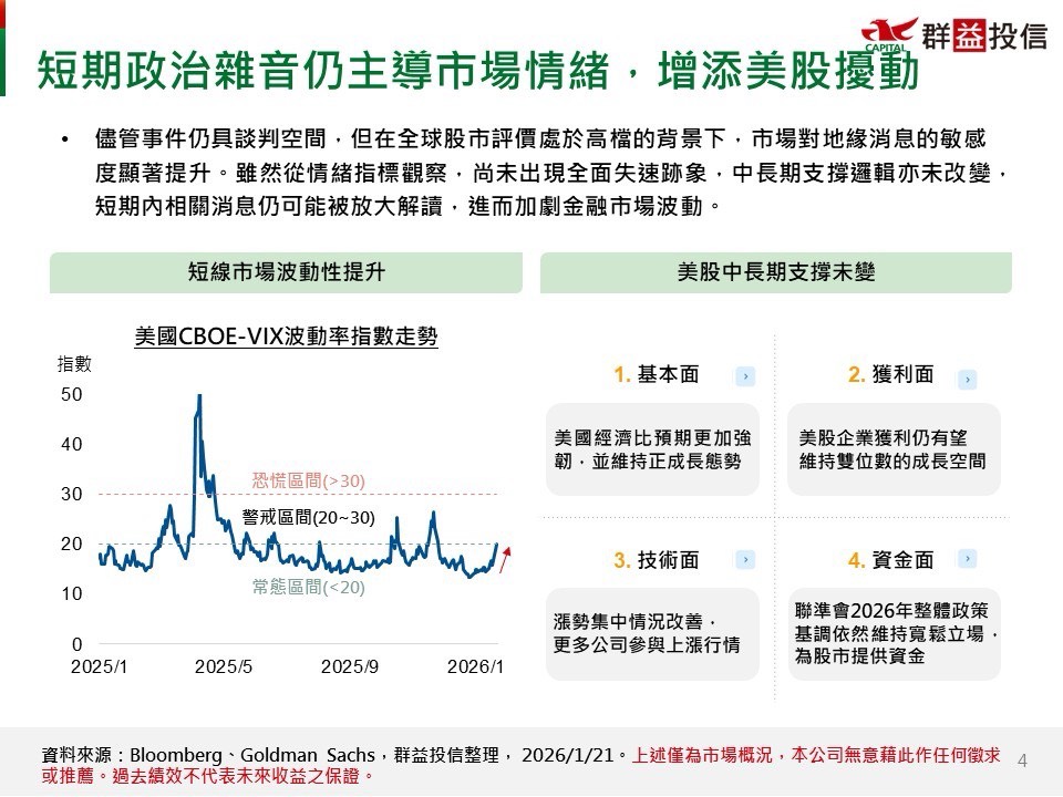 儘管事件仍具談判空間,但在全球股市評價處於高檔的背景下,市場對地緣消息的敏感度顯著提升。雖然從情緒指標觀察,尚未出現全面失速跡象,中長期支撐邏輯亦未改變,短期內相關消息仍可能被放大解讀,進而加劇金融市場波動。