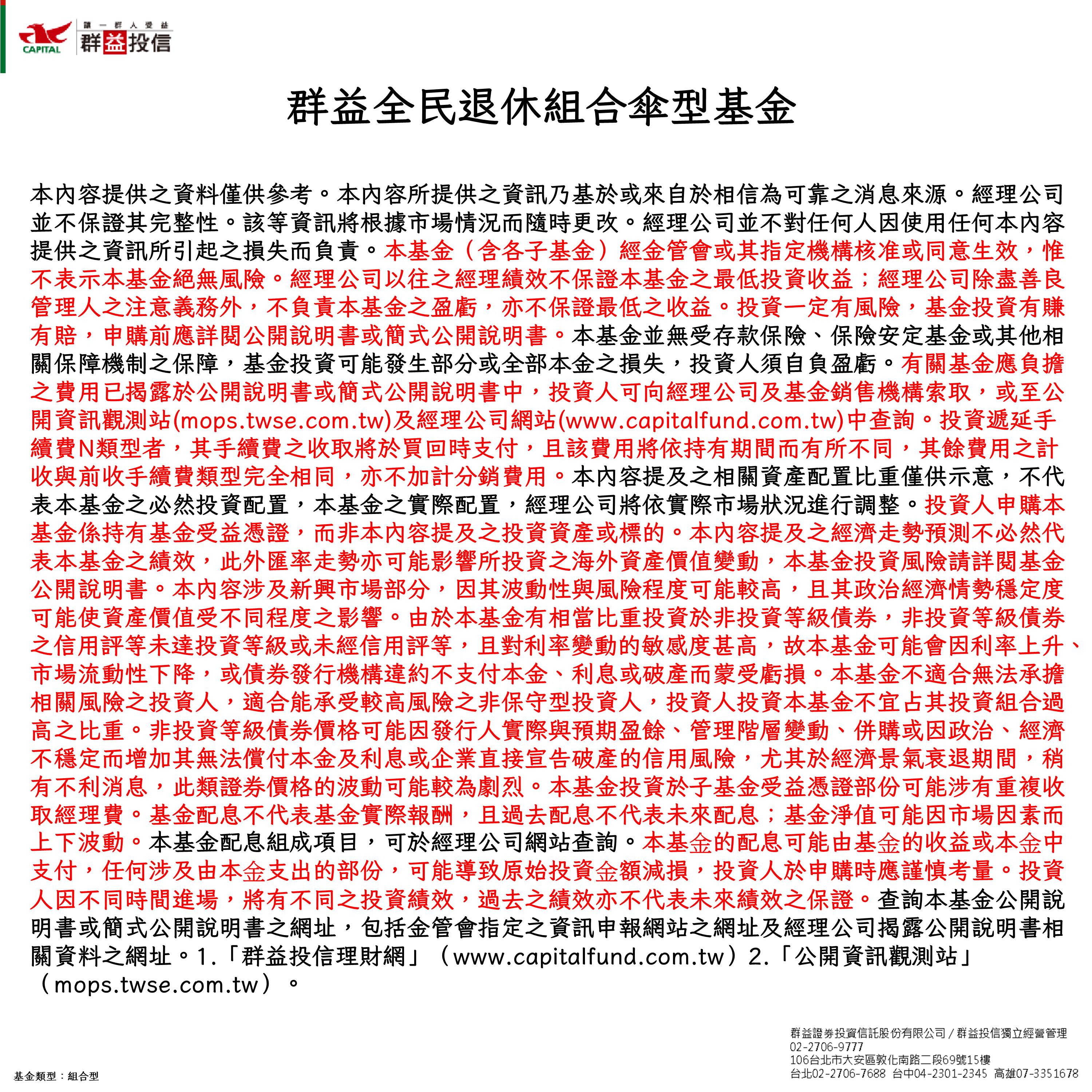 群益全民成長樂退組合基金(本基金有相當比重投資於持有非投資等級高風險債券之基金且配息來源可能為本金)