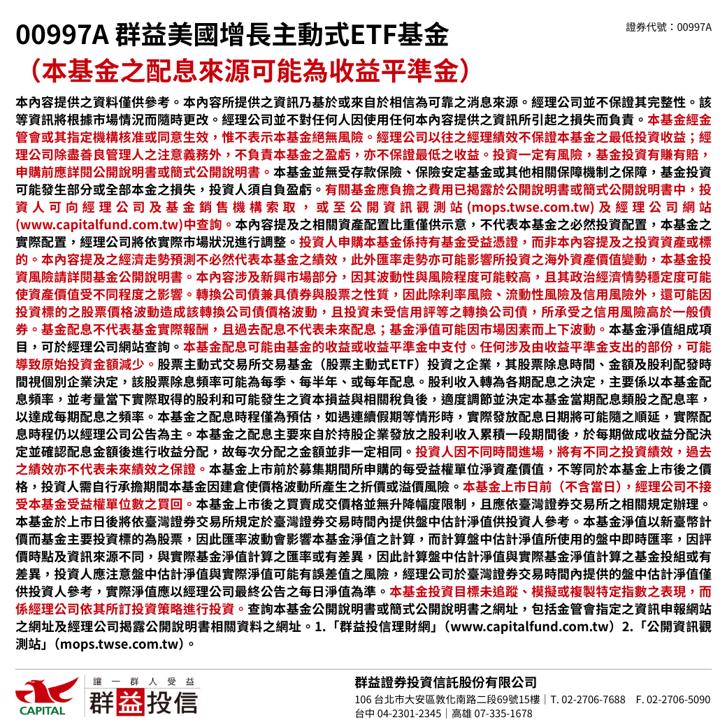 00997A 群益美國增長主動式ETF基金(本基金之配息來源可能為收益平準金)