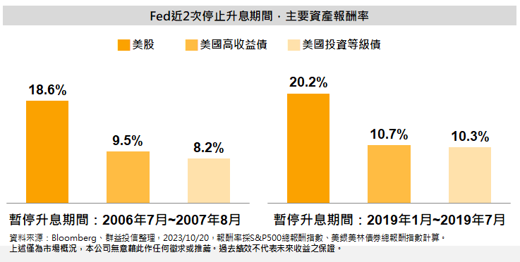 美國聯準會(Fed)主席鮑威爾於10/19發表談話,表示近期美國通膨有降溫跡象,但堅決履行消費者物價指數(CPI)2%的使命,言論暗示Fed可望在11月FOMC會議再次按兵不動,但保留再次加息的可能。在過去的暫停升息循環中,股債資產皆有好表現,若未來貨幣政策能逐步偏鴿,股債中長線可期。