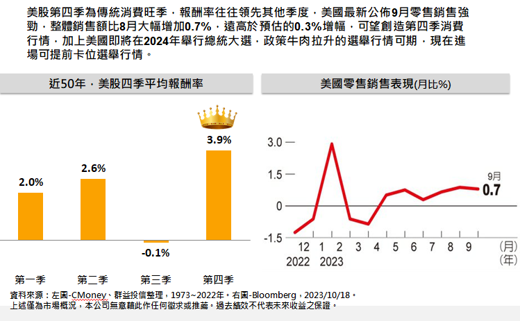 美股第四季為傳統消費旺季,報酬率往往領先其他季度,美國最新公佈9月零售銷售強勁,整體銷售額比8月大幅增加0.7%,遠高於預估的0.3%增幅,可望創造第四季消費行情,加上美國即將在2024年舉行總統大選,政策牛肉拉升的選舉行情可期,現在進場可提前卡位選舉行情。