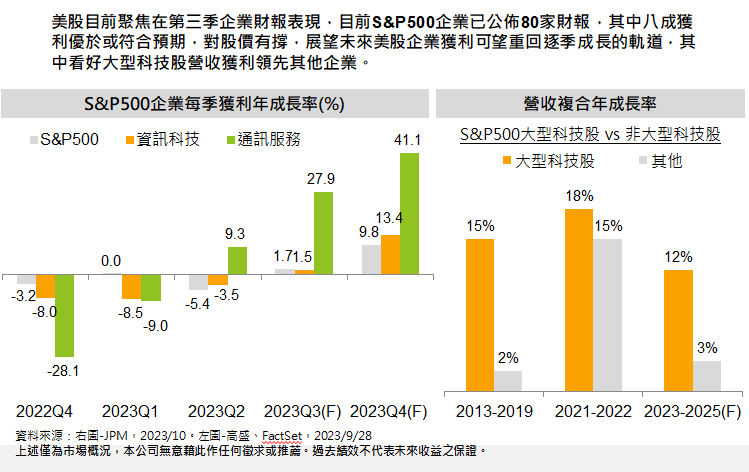 美股目前聚焦在第三季企業財報表現,目前S&P500企業已公佈80家財報,其中八成獲利優於或符合預期,對股價有撐,展望未來美股企業獲利可望重回逐季成長的軌道,其中看好大型科技股營收獲利領先其他企業。