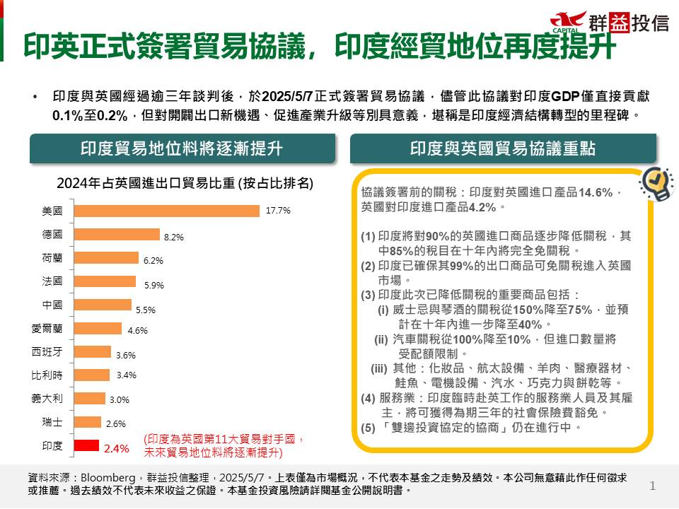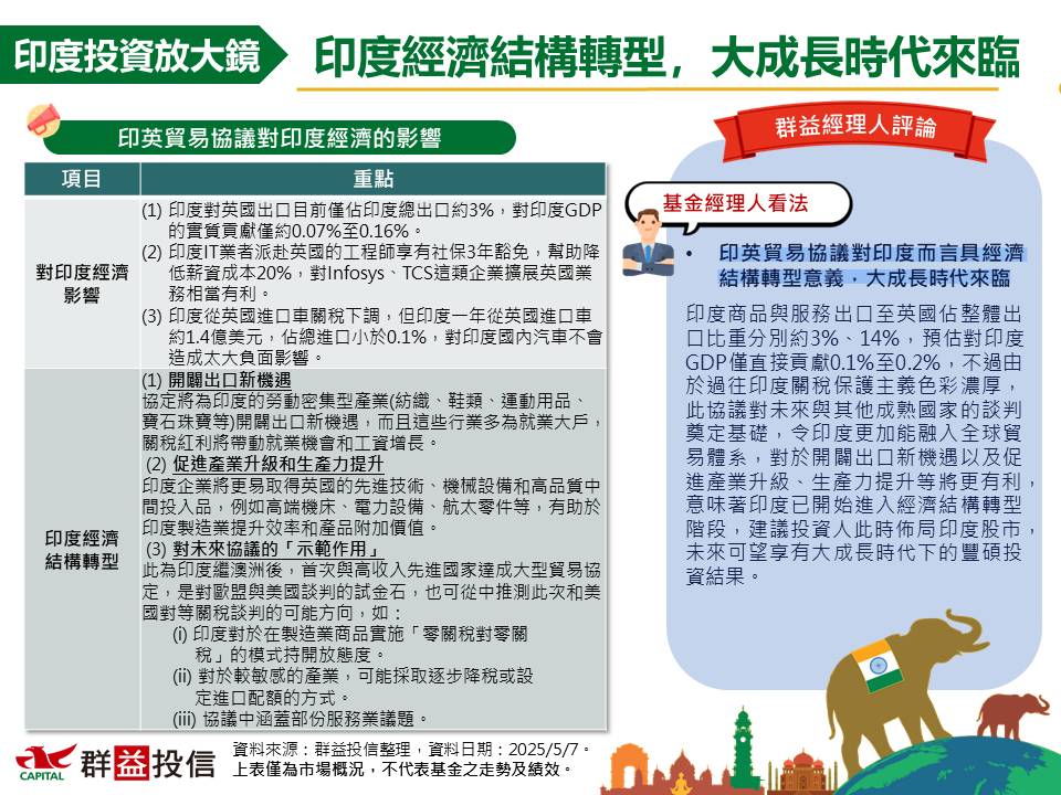 印度商品與服務出口至英國佔整體出口比重分別約3%、14%,預估對印度GDP僅直接貢獻0.1%至0.2%,不過由於過往印度關稅保護主義色彩濃厚,此協議對未來與其他成熟國家的談判奠定基礎,令印度更加能融入全球貿易體系,對於開闢出口新機遇以及促進產業升級、生產力提升等將更有利,意味著印度已開始進入經濟結構轉型階段,建議投資人此時佈局印度股市,未來可望享有大成長時代下的豐碩投資結果。