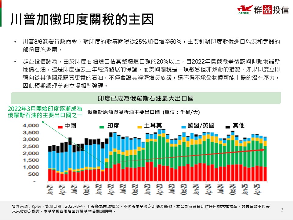 • 川普8/6宣佈對印度對等關稅調升至50%:
