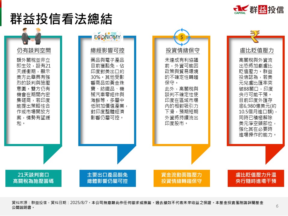 針對直接受美國關稅影響的產業,基金幾乎無持有相關個股。近期增持具內需支撐的消費與醫療保健族群,考量關稅不確定性延長對印度資本支出帶來的不利影響,將進一步降低工業股比重。未來持續關注政策進展與產業調整節奏,尋找具吸引力的進場機會。