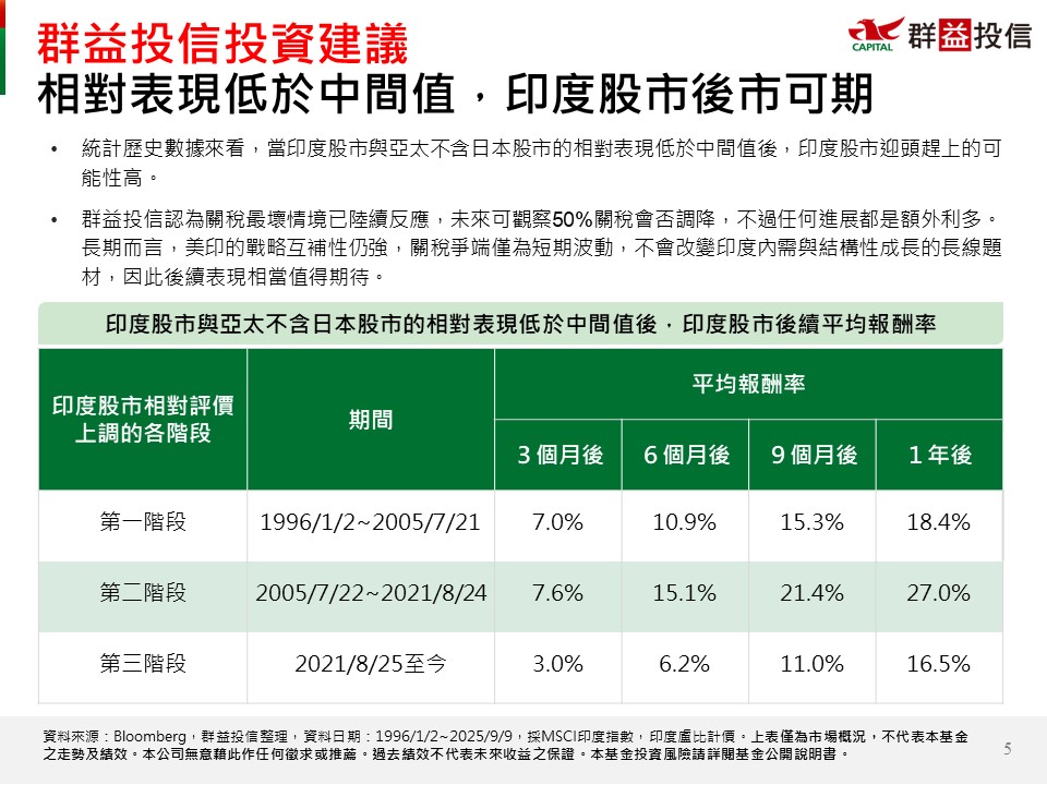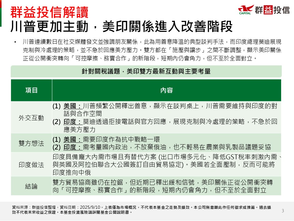 此外,關稅最壞情境已陸續反應,未來可觀察50%關稅會否調降,不過任何進展都是額外利多。長期而言,美印的戰略互補性仍強,關稅爭端僅為短期波動,不會改變印度內需與結構性成長的長線題材,因此後續表現相當值得期待。