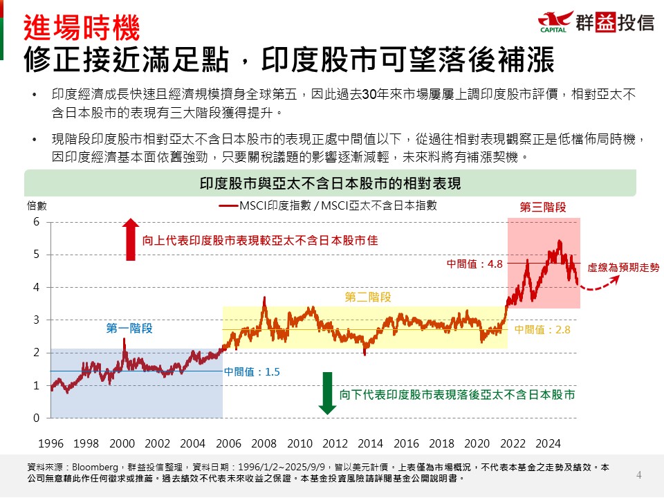 統計歷史數據來看,當印度股市與亞太不含日本股市的相對表現低於中間值後,印度股市迎頭趕上的可能性高。