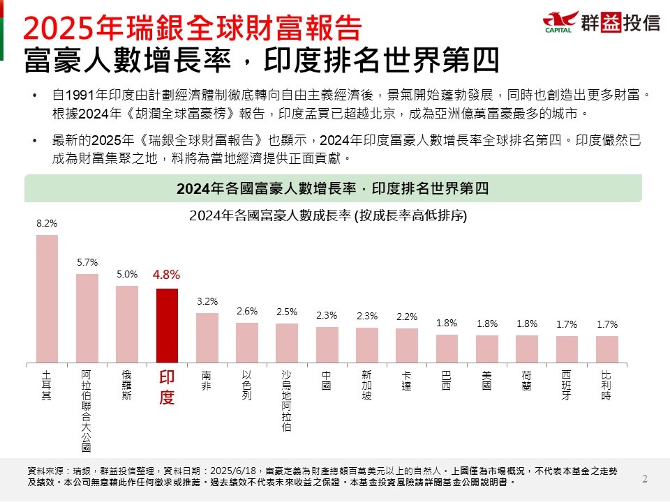 2025年《瑞銀全球財富報告》顯示,2024年印度富豪人數增長率全球排名第四。印度儼然已成為財富集聚之地,料將為當地經濟提供正面貢獻。
