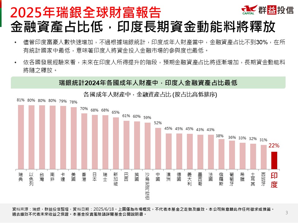 儘管印度富豪人數快速增加,不過根據瑞銀統計,印度成年人財產當中,金融資產占比不到30%,在所有統計國家中最低,依各國發展經驗來看,未來在印度人所得提升的階段,預期金融資產占比將逐漸增加,長期資金動能料將隨之釋放。