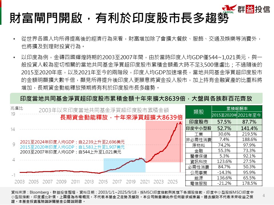 過去十年間,印度當地共同基金淨買超印度股市的金額擴大數千倍,顯見所得提升後印度人更願意將資金投入股市,加上持有金融資產的比重料將增加,長期資金動能釋放預期將有利於印度股市長多趨勢。