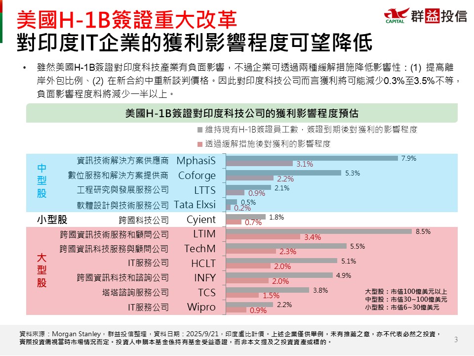 雖然美國H-1B簽證對印度科技產業有負面影響,不過企業可透過兩種緩解措施降低影響性:(1) 提高離岸外包比例、(2) 在新合約中重新談判價格。因此對印度科技公司而言獲利將可能減少0.3%至3.5%不等,負面影響程度料將減少一半以上。