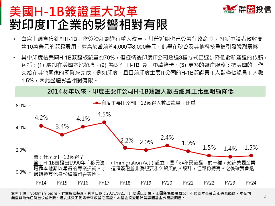 疫情後印度IT公司透過3種方式已逐步降低對新簽證的依賴,包括:(1) 增加在美國本地招聘、(2) 為既有 H-1B 員工申請綠卡、(3) 更多的離岸服務:把美國的工作交給在其他國家的團隊來完成,例如印度。且目前印度主要IT公司的H-1B簽證員工人數僅佔總員工人數1.5%,因此整體影響相對有限。