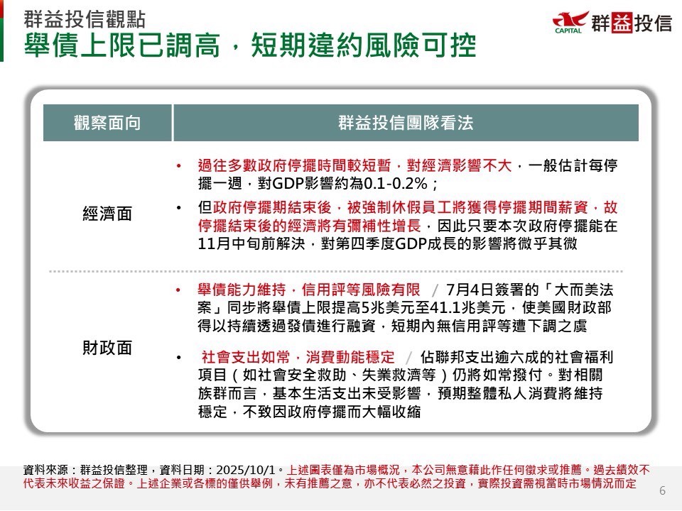 過往停擺時間多屬短暫,對GDP影響有限(每週約0.1–0.2%)。停擺結束後員工薪資補發,經濟具彌補性增長。只要本次停擺能於11月中旬前解決,對Q4成長影響將微乎其微。