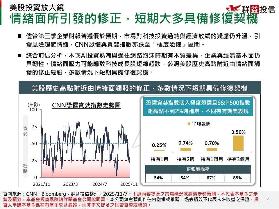綜合前述分析,本次AI投資熱潮與過往網路泡沫時期有本質差異,企業與經濟基本面仍具韌性,情緒面壓力可能導致科技成長股短線超跌,參照美股歷史高點附近由情緒面觸發的修正經驗,多數情況下短期具備修復契機。