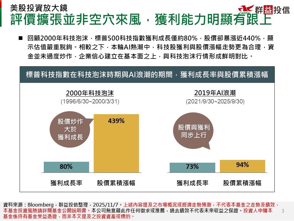 回顧2000年科技泡沫,標普500科技指數獲利成長僅約80%,股價卻暴漲近440%,顯示估值嚴重脫鉤。相較之下,本輪AI熱潮中,科技股獲利與股價漲幅走勢更為合理,資金並未過度炒作,企業信心建立在基本面之上,與科技泡沫行情形成鮮明對比。