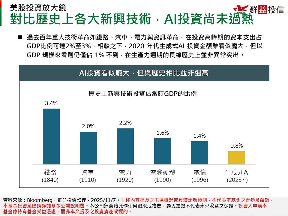 【群益美國投資放大鏡】AI泡沫論引發市場質疑,綜觀歷史,AI投資強度尚未明顯過熱