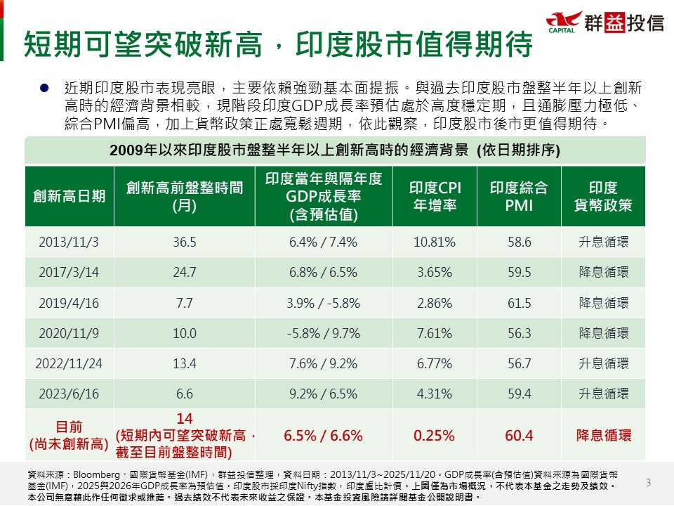 近期印度股市表現亮眼,主要依賴強勁基本面提振。與過去印度股市盤整半年以上創新高時的經濟背景相較,現階段印度GDP成長率預估處於高度穩定期,且通膨壓力極低、綜合PMI偏高,加上貨幣政策正處寬鬆週期,依此觀察,印度股市後市更值得期待。