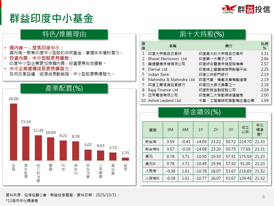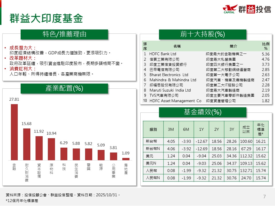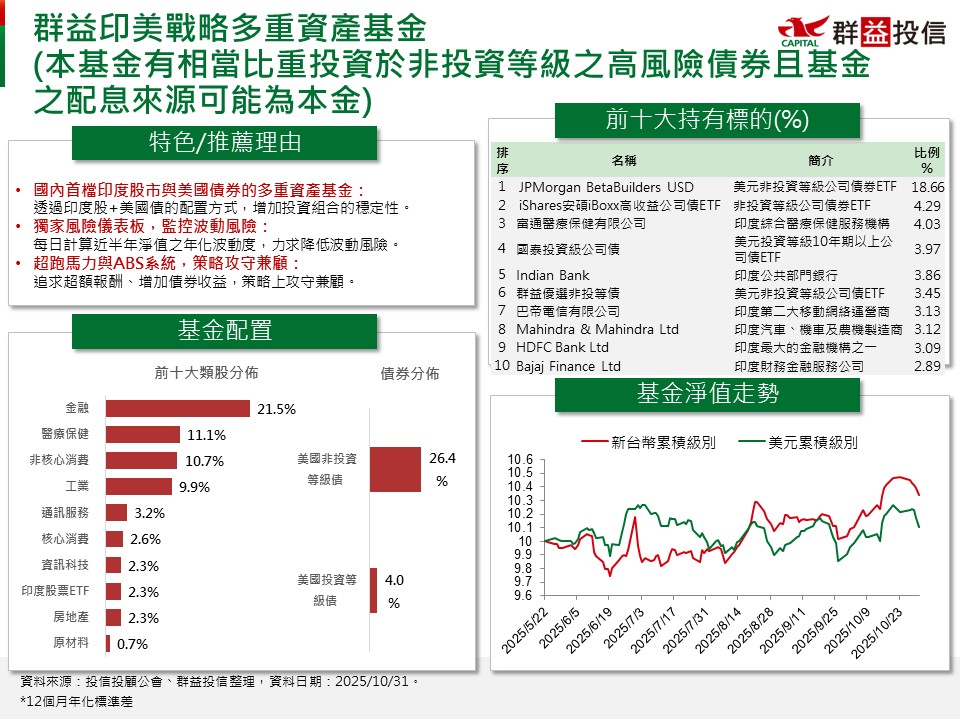 • 延伸閱讀:群益印美戰略多重資產基金(本基金有相當比重投資於非投資等級之高風險站券且基金之配息來源可能為本金)群益印度中小基金群益大印度基金