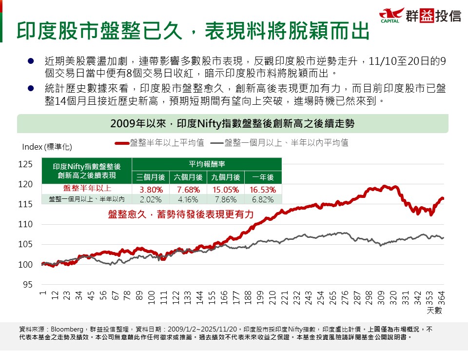近期美股震盪加劇,連帶影響多數股市表現,反觀印度股市逆勢走升,11/10至20日的9個交易日當中便有8個交易日收紅,暗示印度股市料將脫穎而出。統計歷史數據來看,印度股市盤整愈久,創新高後表現更加有力,而目前印度股市已盤整14個月且接近歷史新高,預期短期間有望向上突破,進場時機已然來到。