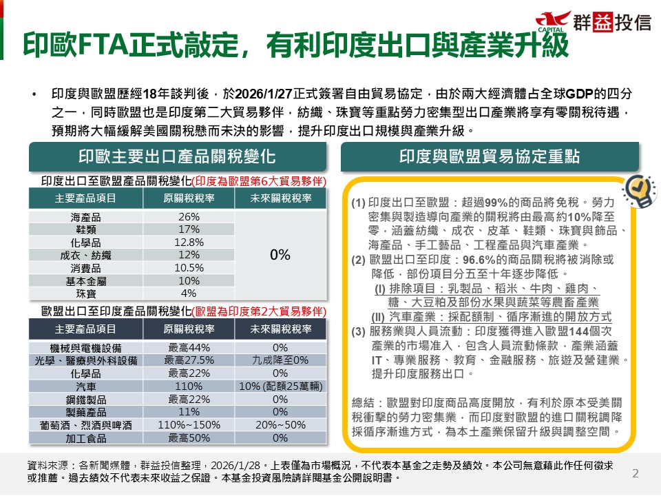 • 印度與歐盟歷經18年談判後,於1/27正式簽署自由貿易協定,由於兩大經濟體占全球GDP的四分之一,同時歐盟也是印度第二大貿易夥伴,紡織、珠寶等重點勞力密集型出口產業將享有零關稅待遇,預期將大幅緩解美國關稅懸而未決的影響,提升印度出口規模與產業升級。