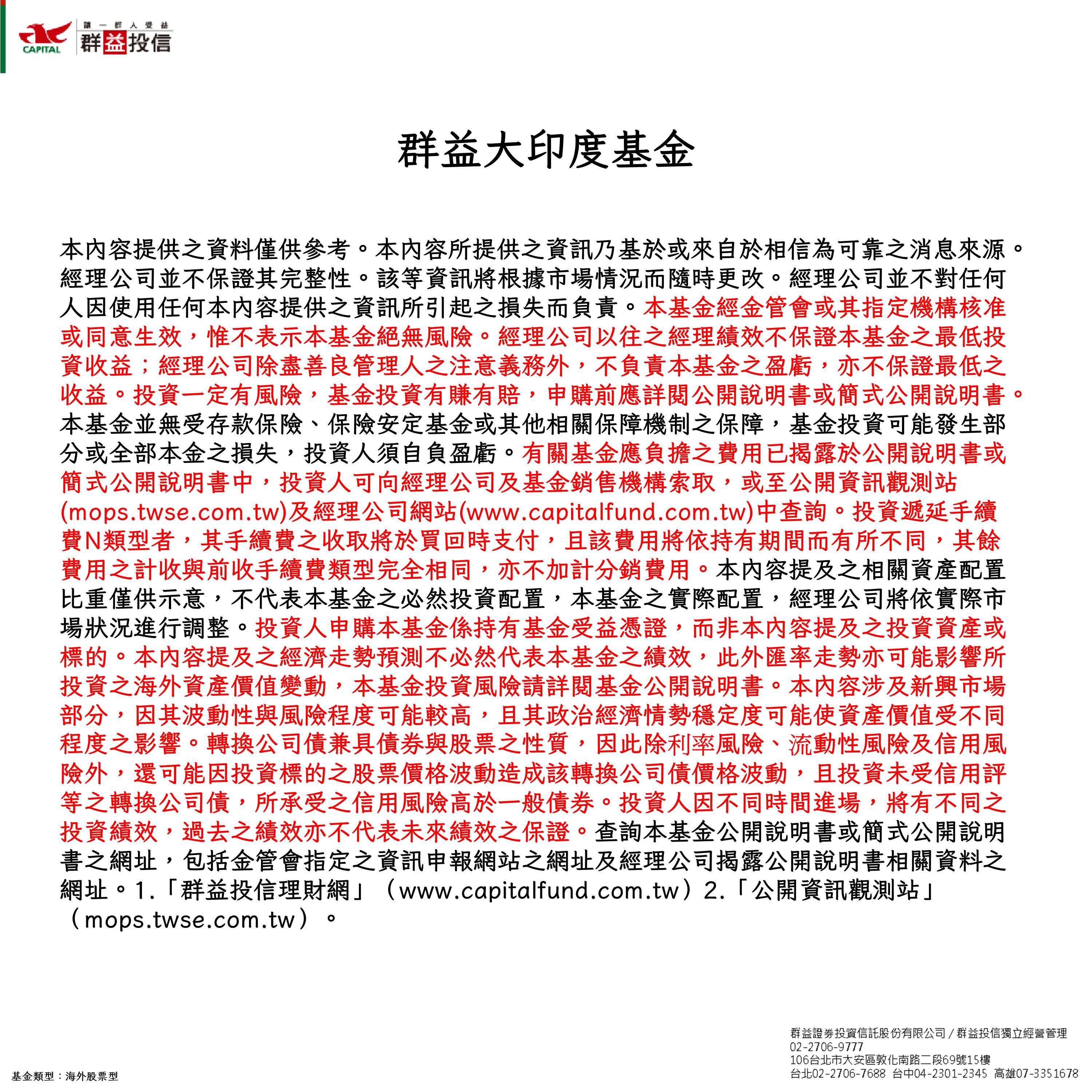 群益投信獨立經營管理。本網站提供之資料僅供參考。本網站所提供之資訊乃基於或來自於相信為可靠之消息來源。經理公司並不保證其完整性。該等資訊將根據市場情況而隨時更改。經理公司並不對任何人因使用任何本網站提供之資訊所引起之損失而負責。系列基金經金管會或其指定機構核准或同意生效,惟不表示系列基金絕無風險。經理公司以往之經理績效不保證系列基金之最低投資收益;經理公司除盡善良管理人之注意義務外,不負責系列基金之盈虧,亦不保證最低之收益。投資一定有風險,基金投資有賺有賠,申購前應詳閱公開說明書或簡式公開說明書。系列基金並無受存款保險、保險安定基金或其他相關保障機制之保障,基金投資可能發生部分或全部本金之損失,投資人須自負盈虧。有關基金應負擔之費用已揭露於公開說明書或簡式公開說明書中,投資人可向經理公司及基金銷售機構索取,或至公開資訊觀測站(mops.twse.com.tw)及經理公司網站(www.capitalfund.com.tw)中查詢。投資遞延手續費N類型者,其手續費之收取將於買回時支付,且該費用將依持有期間而有所不同,其餘費用之計收與前收手續費類型完全相同,亦不加計分銷費用。本網站提及之相關資產配置比重僅供示意,不代表系列基金之必然投資配置,系列基金之實際配置,經理公司將依實際市場狀況進行調整。投資人申購系列基金係持有基金受益憑證,而非本網站提及之投資資產或標的。本網站提及之經濟走勢預測不必然代表系列基金之績效,此外匯率走勢亦可能影響所投資之海外資產價值變動,系列基金投資風險請詳閱基金公開說明書。本網站涉及新興市場部分,因其波動性與風險程度可能較高,且其政治經濟情勢穩定度可能使資產價值受不同程度之影響。基金配息不代表基金實際報酬,且過去配息不代表未來配息;基金淨值可能因市場因素而上下波動。系列基金淨值/配息組成項目,可於經理公司網站查詢。系列基金配息可能由基金的收益或本金/收益平準金中支付。任何涉及由本金/收益平準金支出的部份,可能導致原始投資金額減少。投資人因不同時間進場,將有不同之投資績效,過去之績效亦不代表未來績效之保證。本網站如涉及系列被動式ETF追蹤指數績效或殖利率之表現,不代表系列被動式ETF之實際報酬率或配息率及未來績效保證,不同時間進場投資,其結果將可能不同,且並未考量交易成本。系列主動式ETF投資目標未追蹤、模擬或複製特定指數之表現,而係經理公司依其所訂投資策略進行投資。查詢系列基金公開說明書或簡式公開說明書之網址,包括金管會指定之資訊申報網站之網址及經理公司揭露公開說明書相關資料之網址。1.「群益投信理財網」(www.capitalfund.com.tw)2.「公開資訊觀測站」(mops.twse.com.tw)。