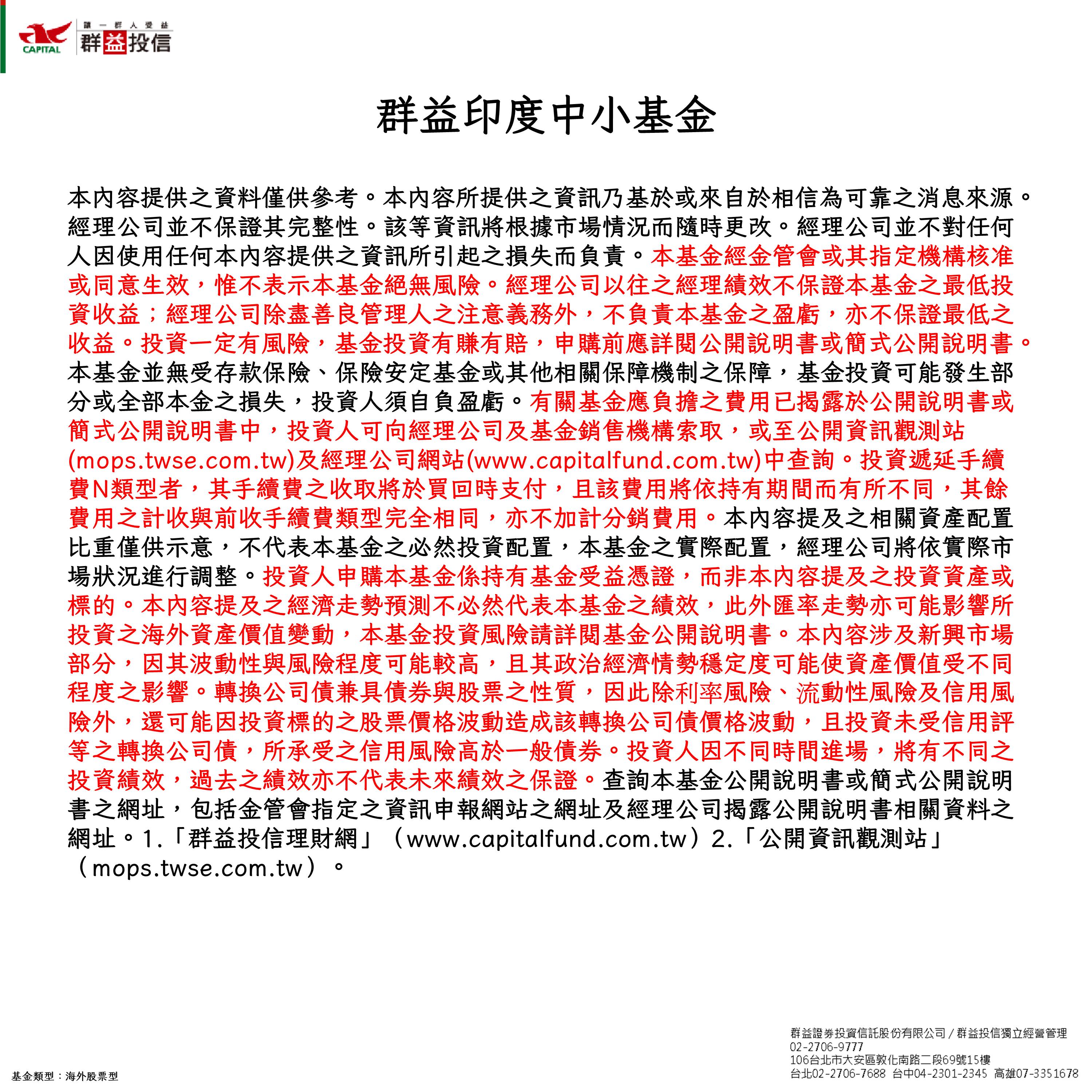 • 延伸閱讀:群益印美戰略多重資產基金(本基金有相當比重投資於非投資等級之高風險站券且基金之配息來源可能為本金)群益印度中小基金群益大印度基金
