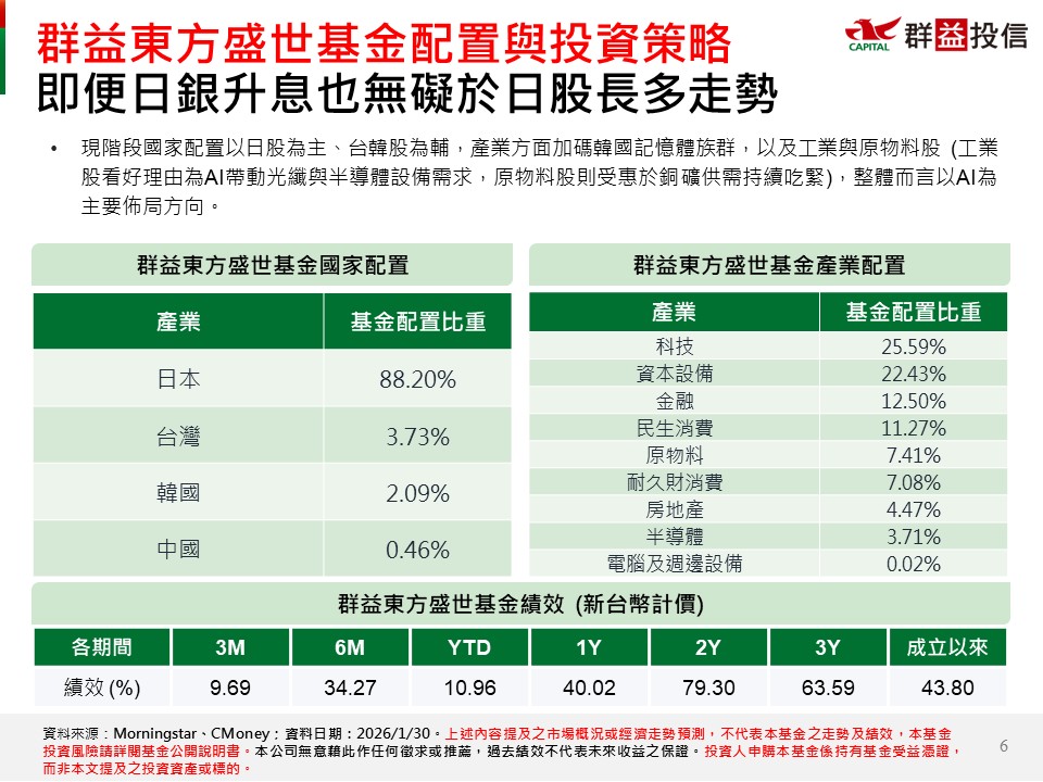 現階段國家配置以日股為主、台韓股為輔,產業方面加碼韓國記憶體族群,以及工業與原物料股 (工業股看好理由為AI帶動光纖與半導體設備需求,原物料股則受惠於銅礦供需持續吃緊),整體而言以AI為主要佈局方向。