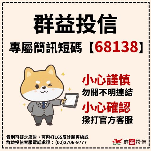 為了預防詐騙陷阱,請認明群益投信專屬簡訊短碼【68138】❤️