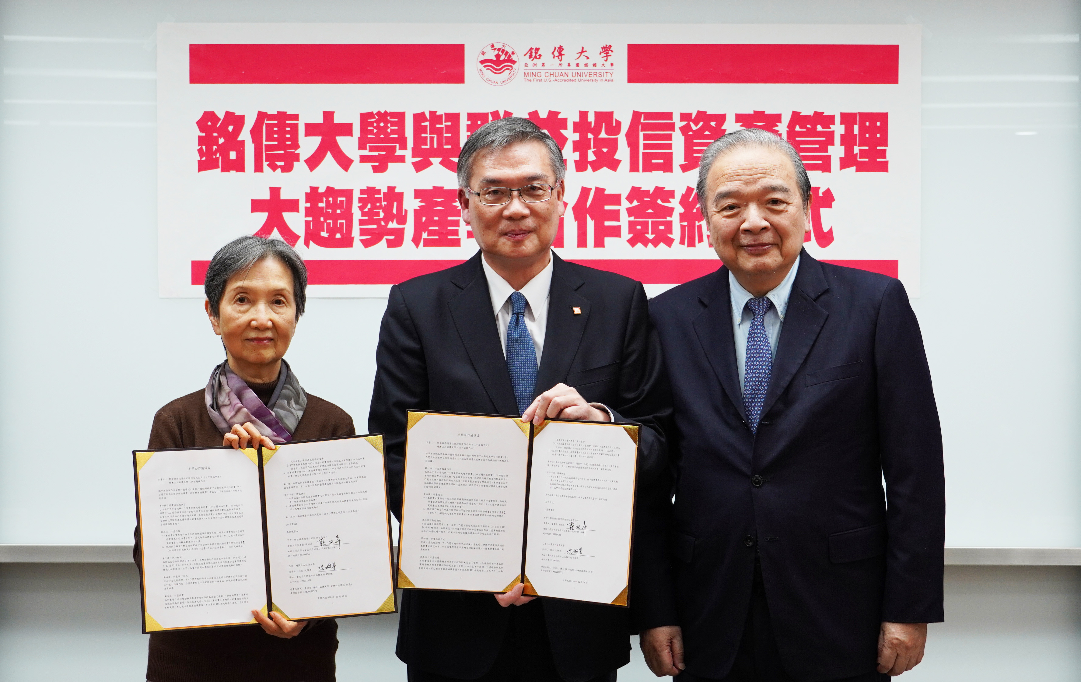 群益投信與銘傳大學「資產管理大趨勢」產學合作簽約儀式,由群益投信賴政昇董事長(中)、銘傳大學校長沈佩蒂(左)、銘傳大學總校長李銓(右)合影